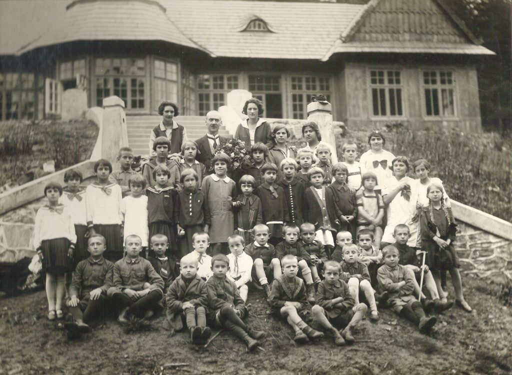 Grupa dzieci przed budynkiem brzozowskich „łazienek”