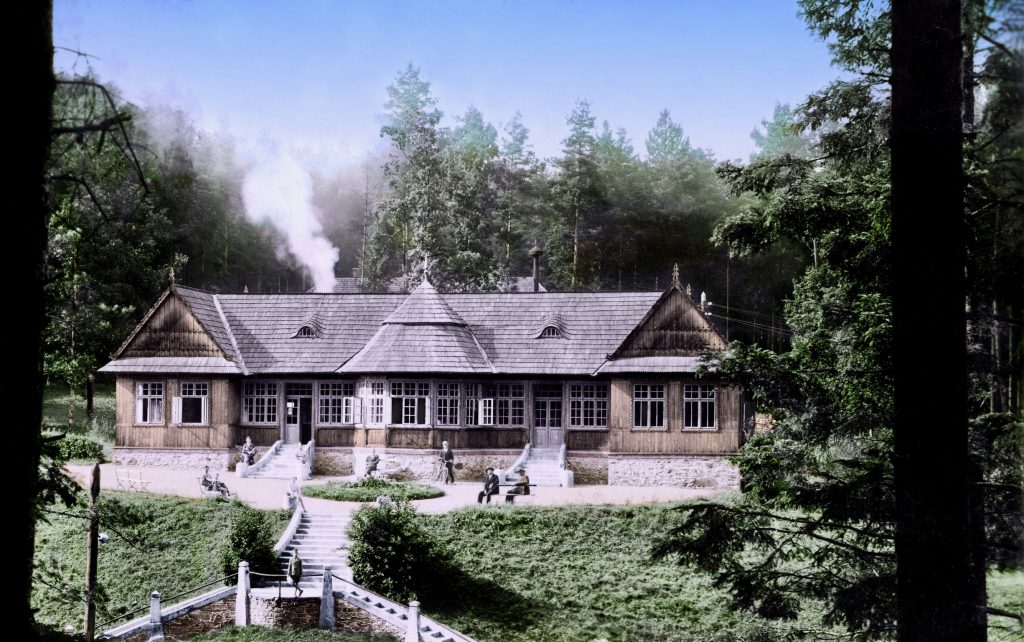 Fotografia w wersji koloryzowanej doskonale uwidocznia, iż za gmachem „łazienek” znajdował się jeszcze drugi budynek, który przeznaczony był najprawdopodobniej do prac gospodarczych.