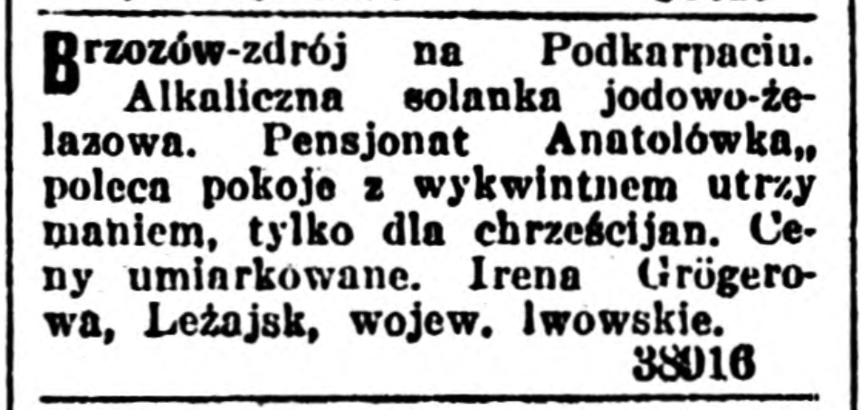 Ogłoszenie dotyczące działalności Zakładu Zdrojowego w Brzozowie ze numeru 118 „Kuriera Warszawskiego” z dnia 1 maja 1930 roku. Wspomnianą gazetę wydawano w Warszawie w latach 1821-1939. Powiązana była ze środowiskiem sympatyzującym ze Stronnictwem Chrześcijańsko-Narodowym.