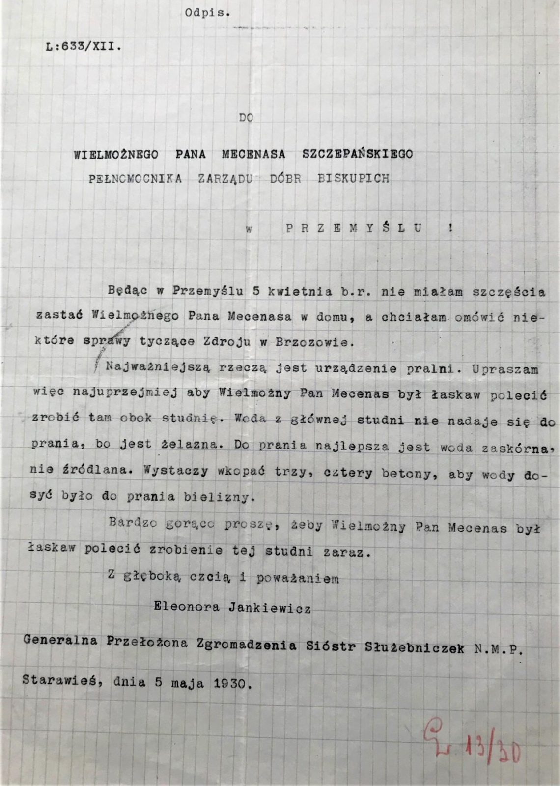 Odpis dokumentu dotyczącego kwestii budowy dodatkowej studni na wodę zaskórną. Pomimo iż wody zdrojowe wykazywały niebagatelne właściwości lecznicze, nie nadawały się zbytnio do bieżących prac w uzdrowisku (np. przy praniu).