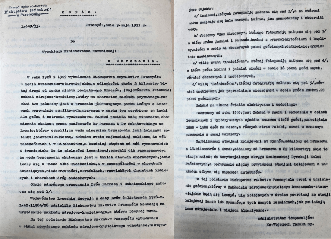 Dokument ten stanowi doskonały i zwięzły opis głównych zabudowań zdrojowych. Przedstawia także pokrótce obszar użytkowy kompleksu uzdrowiskowego, a także prezentuje właściwości i skład brzozowskich wód mineralnych.