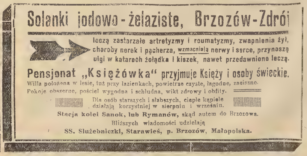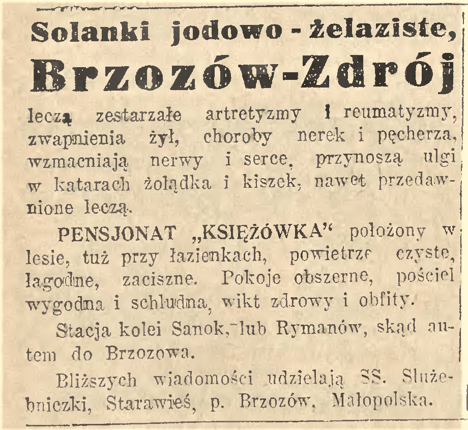 Reklamy uzdrowiska w Brzozowie z czasopisma „Głos Narodu (numery 154 i 216, 1933 rok). Wspomniane czasopismo było krakowskim dziennikiem informacyjno-publicystycznym wydawanym w latach 1893-1939. Jego redakcja reprezentowała orientację chrześcijańsko-demokratyczną.